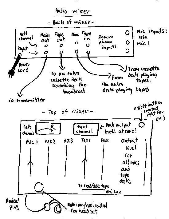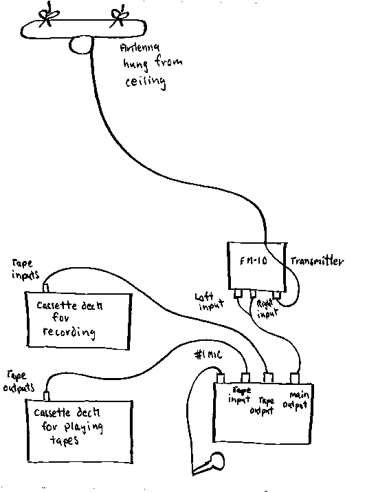The basic technical components are the transmitter, antenna, audio mixer, microphones, mic stands and a home stereo cassette deck.
