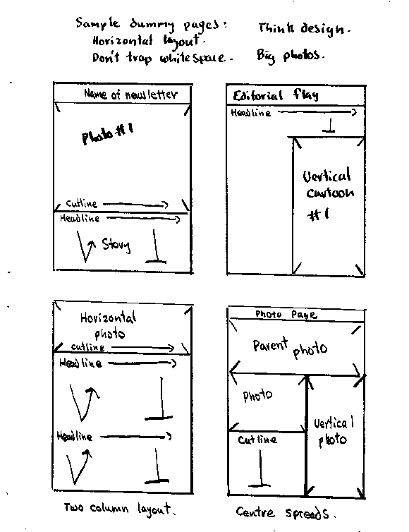 Use dummy pages to design your newsletter. Check out the sample pages and use a broad marker to arrange your stories and photos in a pleasing design. Mark in the size of photos and the first few words of the cutline/headlines. You have been given page "flags" so you can "departmentalize" your newsletter according to content categories. Your dummy represents a page 8_ x 11; it begins vertically one quarter inch below the folio line and ends one half inch from the bottom of the page.